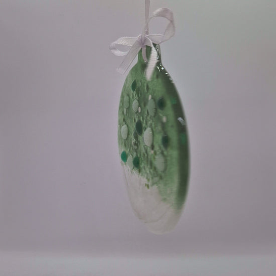 Reflecting a more traditional Christmas colourway, this stunning decoration is created layering glass powders, paint, frit and murrini flowers in beautify green and classic white hues upon a clear base before firing multiple times and finished with a white ribbon ready to hang.
