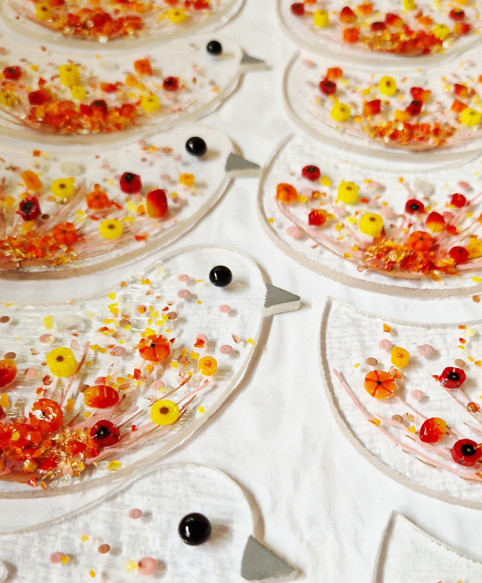 A fused glass bead eye finishes the face, giving each and every one of these little birds, their own unique expression.