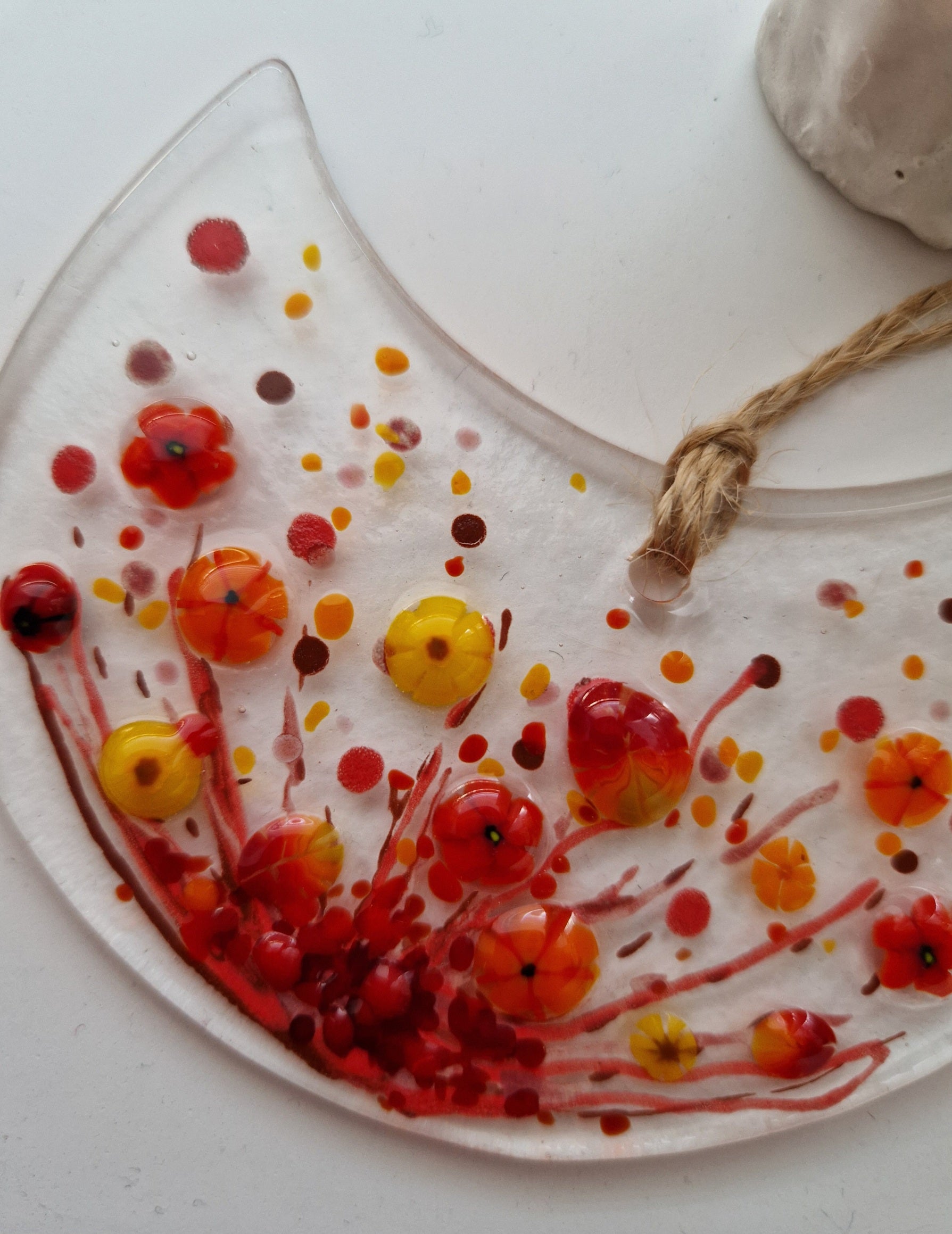 Hand crafted fused glass red robin hanging ornament in our popular Autumn Meadow design. Suitable for all year round or as a Christmas decoration.
