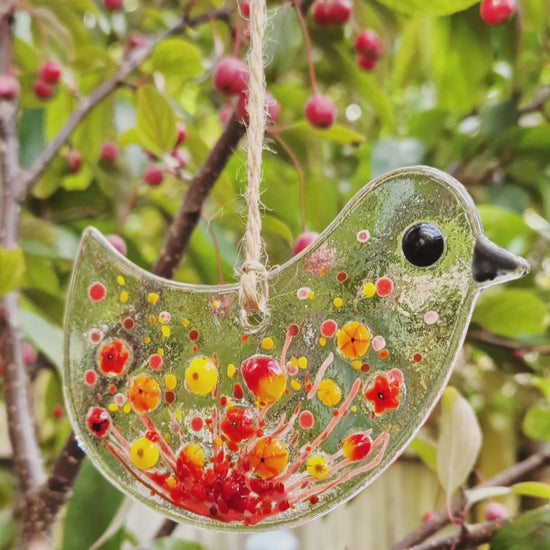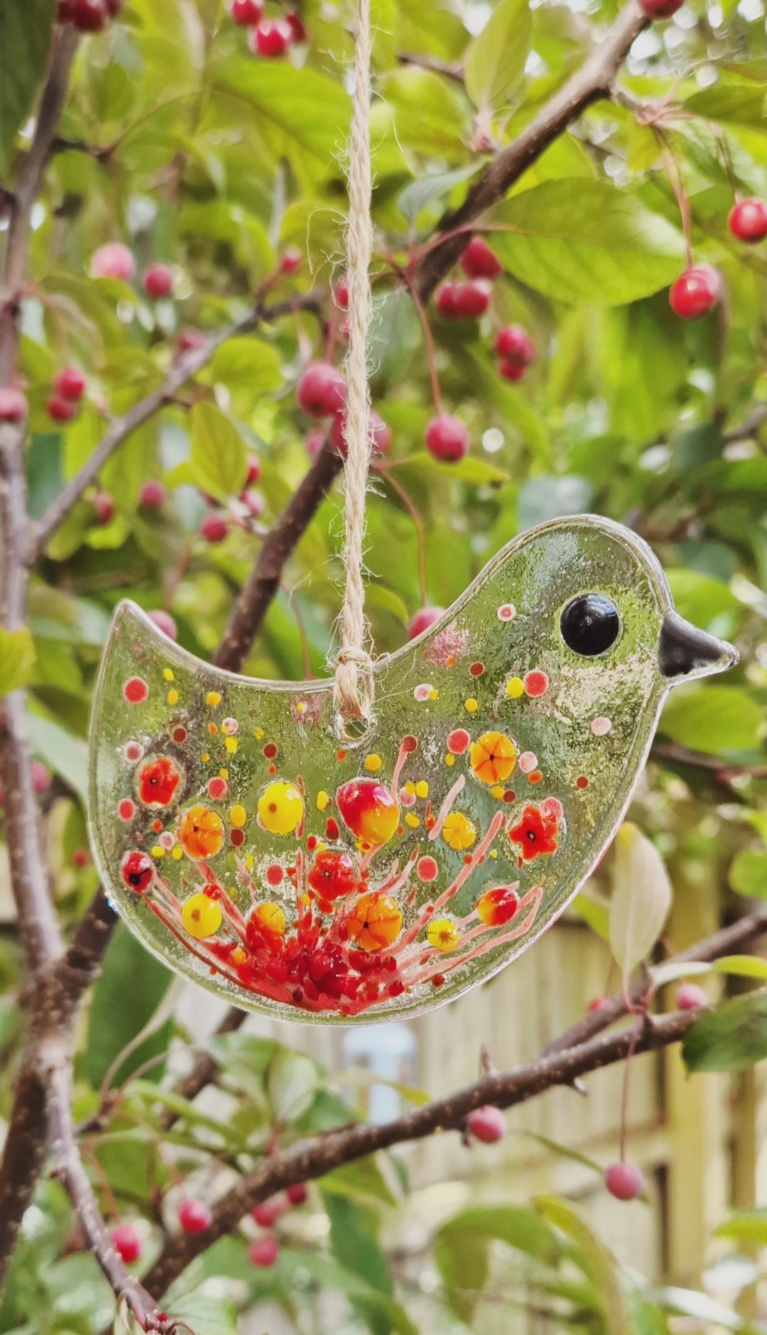 Created by hand painting glass paint, frit and murrini in wonderful Autumnal hues upon a clear robin shaped base before firing and finished with a simple jute string ready to hang.