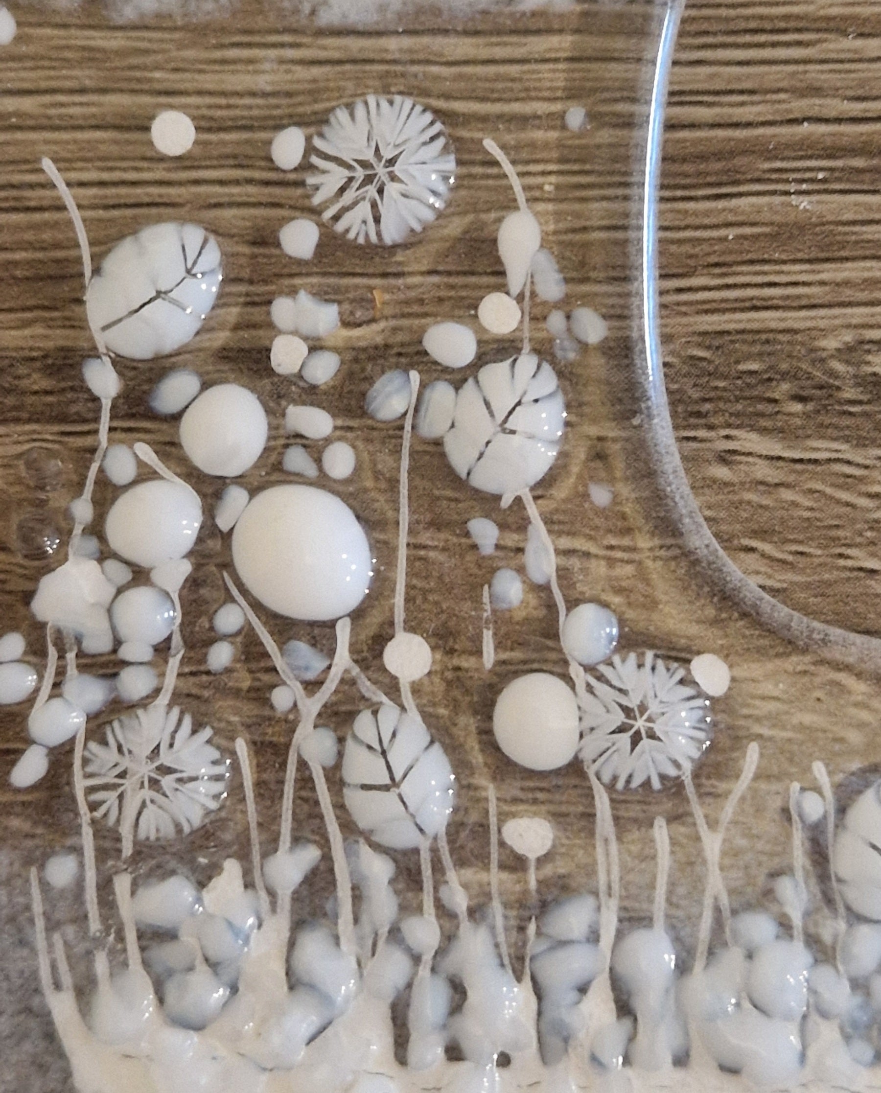 This delicate piece is created layering glass powders, paint, frit and murrini in crisp white hues against a clear base before firing multiple times and finished with a white ribbon ready to hang.