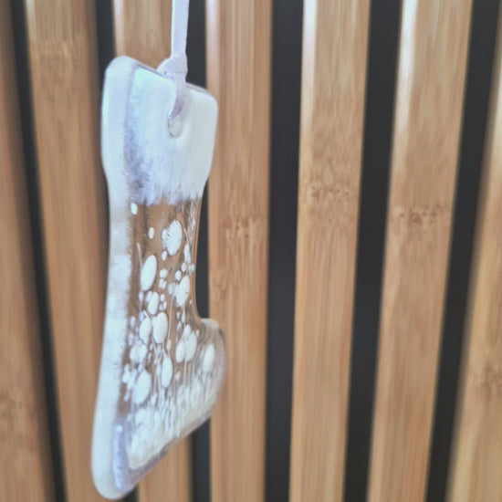 Hand crafted fused glass white Christmas stocking / boot decoration in our very popular meadow design.